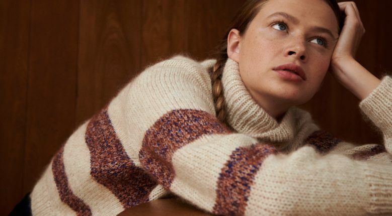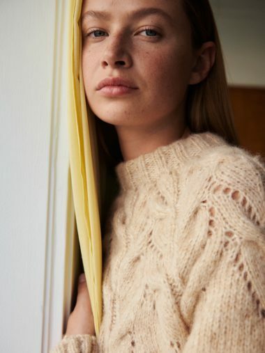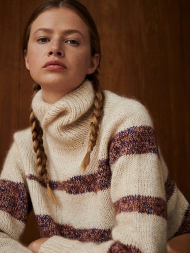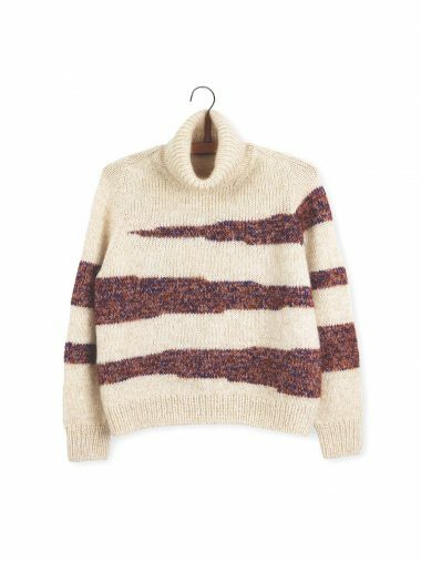 Sycamore Sweater是由上往下織的結構。領圍由多個條紋構成,並從肩膀一路加針,最後呈現高領。 條紋的設計是有機稍微不規則,使用到日式引返技巧創造不規則的紋路。 在 Sycamore Sweater 你可以大膽的探索顏色組合,條紋是使用四股線一起合織,其中三股為 Spinni 再加一股絲毛海。衣服的主色則是由 Jensen 與絲毛海一起合織。