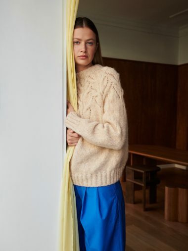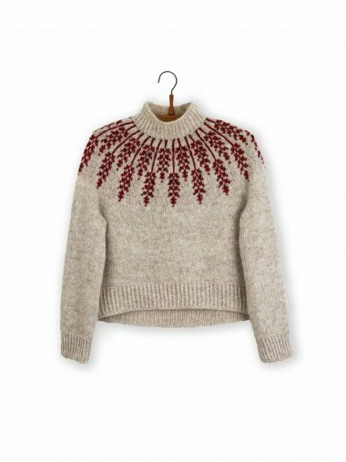 Laurel 套頭衣是一體編織的從一邊袖子到另一邊袖子,領口兩側各有一個楔形,使得套頭衣非常合身。