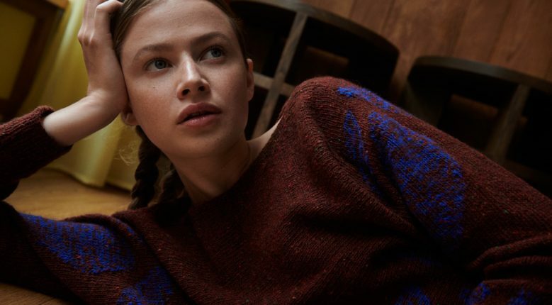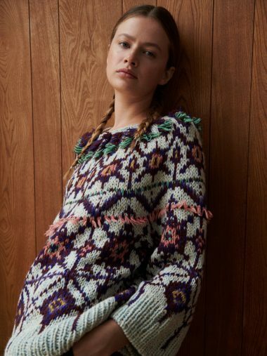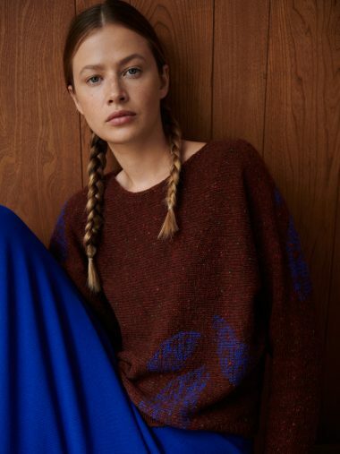 LUPIN sweater 靈感來自美麗多彩的魯賓花,其長長的花尖既浪漫又迷人。 領口的花樣是對野性和美麗的花朵的詮釋,交錯的花莖圖案像華麗的珠寶懸在肩膀上。