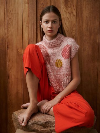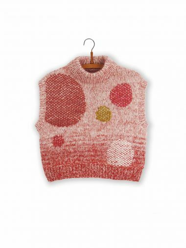我一直對漸變色著迷,也經常我的設計中使用到。 Botanica 系列的mood board裡有一幅漂亮的畫,帶有可愛的漸變紅色和一些泡泡。 我試圖將這種靈感轉化為一件舒適的背心,使用我的浸染技術和從下擺綻放的刺繡泡泡。