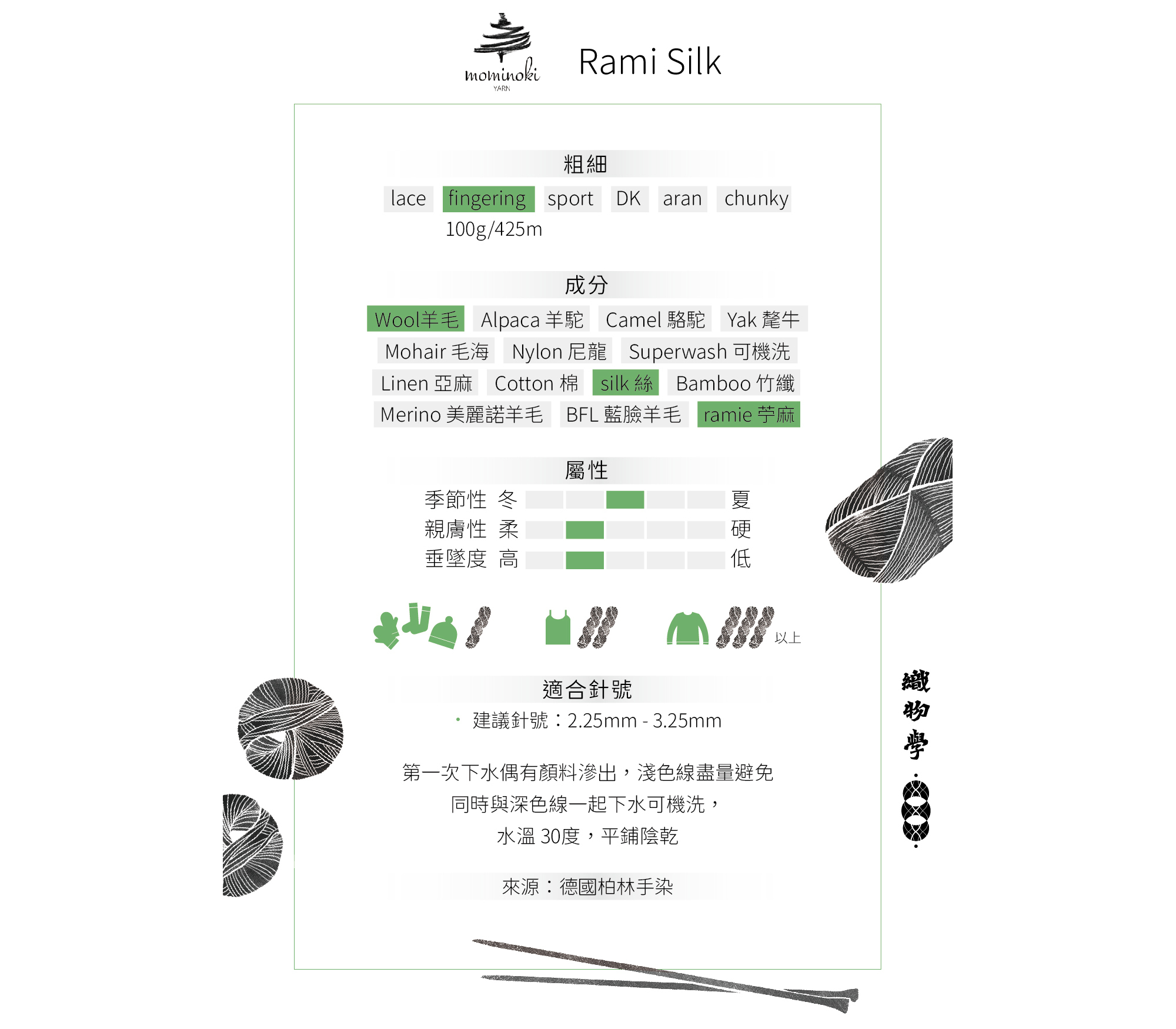 成分 : 60% 羊毛(non superwash wool), 20% 絲(silk),20% 苧麻(ramie)
